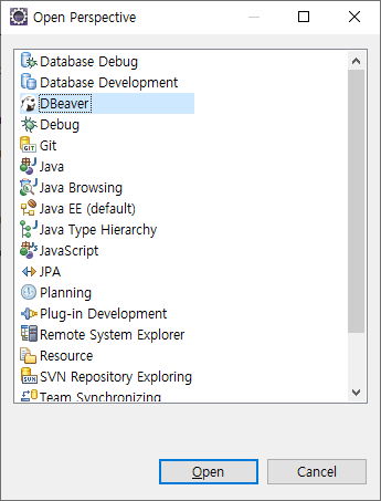 이클립스가 재 실행된 후 우측 상단의 Open Perspective를 클릭하여 DBeaver를 선택합니다.