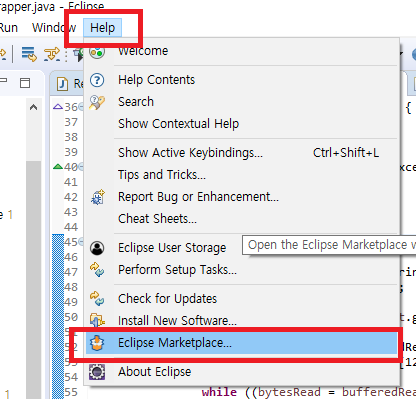 이클립스 상단 메뉴에서 Help > Eclipse Marketplace를 선택합니다.