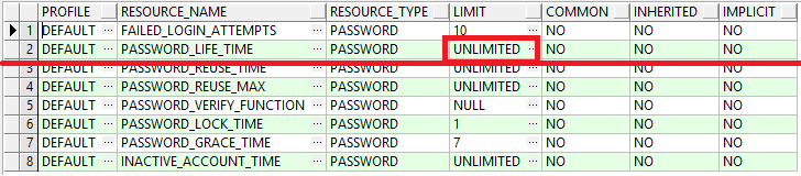 SELECT * FROM DBA_PROFILES A WHERE A.profile = 'DEFAULT' AND A.resource_type = 'PASSWORD';