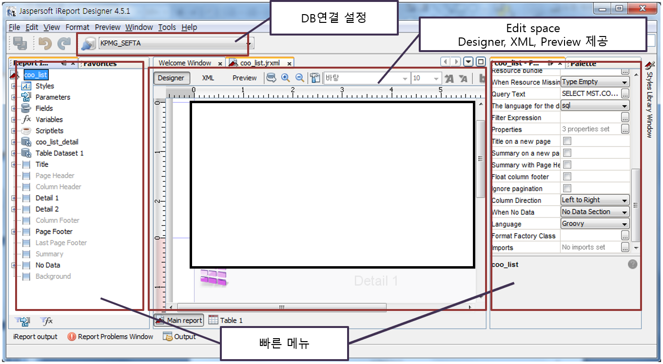 즉, iReport는 JasperReports를 위한 Reports Design Tool이라고 할 수 있다.