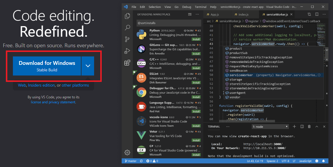 Visual Studio Code is a code editor redefined and optimized for building and debugging modern web and cloud applications. Visual Studio Code is free and available on your favorite platform - Linux, macOS, and Windows.