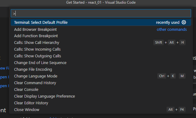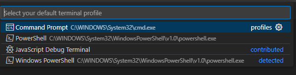 Terminal : Select Default Profile 선택 후 Command Prompt를 선택하여 기본 터미널 프로그램을 선택합니다.